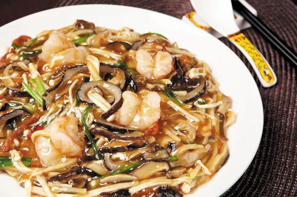 Hidangan tumis Tiongkok yang disajikan dengan saus kental yang bening dan gurih.